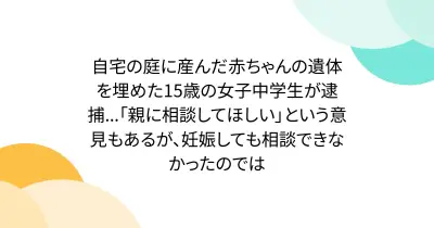 自宅の庭に産んだ赤ちゃんの遺体を埋めた15歳の女子中学生が逮捕...「親に相談してほしい」という意見もあるが、妊娠しても相談できなかったのでは
