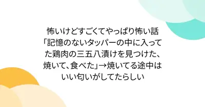怖いけどすごくてやっぱり怖い話「記憶のないタッパーの中に入ってた鶏肉の三五八漬けを見つけた、焼いて、食べた」→焼いてる途中はいい匂いがしてたらしい