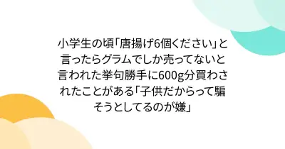 小学生の頃「唐揚げ6個ください」と言ったらグラムでしか売ってないと言われた挙句勝手に600g分買わされたことがある「子供だからって騙そうとしてるのが嫌」