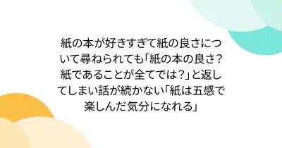 紙の本が好きすぎて紙の良さについて尋ねられても「紙の本の良さ?紙であることが全てでは?」と返してしまい話が続かない「紙は五感で楽しんだ気分になれる」