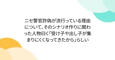ニセ警官詐偽が流行っている理由について、そのシナリオ作りに関わった人物曰く「受け子や出し子が集まりにくくなってきたから」らしい