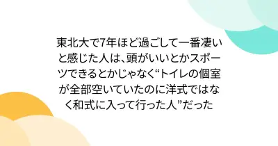 東北大で7年ほど過ごして一番凄いと感じた人は、頭がいいとかスポーツできるとかじゃなく“トイレの個室が全部空いていたのに洋式ではなく和式に入って行った人”だった