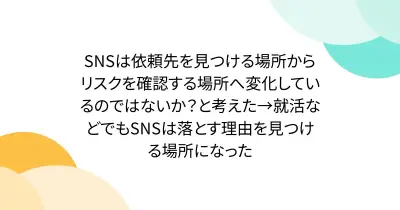 SNSは依頼先を見つける場所からリスクを確認する場所へ変化しているのではないか?と考えた→就活などでもSNSは落とす理由を見つける場所になった