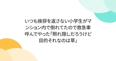 いつも挨拶を返さない小学生がマンション内で倒れてたので救急車呼んでやった「照れ隠しだろうけど目的それなのは草」