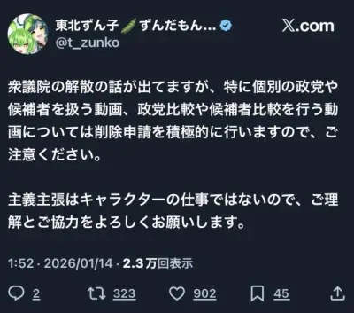 ずんだもん公式、ブチ切れ「衆議院解散の話が出ていますがそういう動画は消します。主義主張はキャラクターの仕事ではありません」