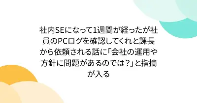 社内SEになって1週間が経ったが社員のPCログを確認してくれと課長から依頼される話に「会社の運用や方針に問題があるのでは?」と指摘が入る