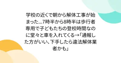 学校の近くで朝から解体工事が始まった...7時半から8時半は歩行者専用で子どもたちの登校時間なのに堂々と車を入れてくる→「通報した方がいい、下手したら違法解体業者かも」