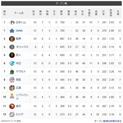 オープン戦順位表(3/15)wwwwwwwwwwwwwwwwwwwwwwwwww