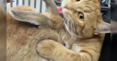 「愛情がスゴ過ぎて逆に迷惑なヤツ」ネコがウサギの毛づくろいをしていたが勢いがもはや食べていてエグかった