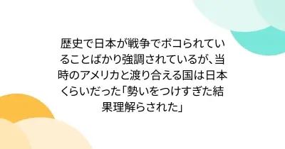 歴史で日本が戦争でボコられていることばかり強調されているが、当時のアメリカと渡り合える国は日本くらいだった「勢いをつけすぎた結果理解らされた」