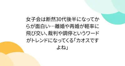 女子会は断然30代後半になってからが面白い…離婚や再婚が軽率に飛び交い、裁判や調停というワードがトレンドになってくる「カオスですよね」