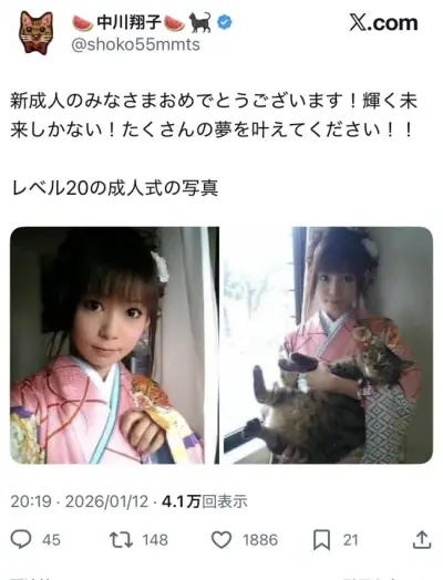 【画像】中川翔子さん(40)「新成人のみなさん!おめでとうございます!輝く未来しかない!」←何故か自分の20年前の写真をあげ叩かれる