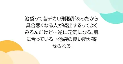池袋って昔デカい刑務所あったから具合悪くなる人が続出するってよくみるんだけど…逆に元気になる、肌に合っている→池袋の良い所が寄せられる