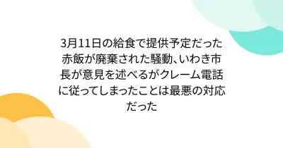 3月11日の給食で提供予定だった赤飯が廃棄された騒動、いわき市長が意見を述べるがクレーム電話に従ってしまったことは最悪の対応だった