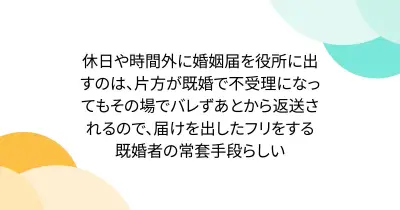 休日や時間外に婚姻届を役所に出すのは、片方が既婚で不受理になってもその場でバレずあとから返送されるので、届けを出したフリをする既婚者の常套手段らしい