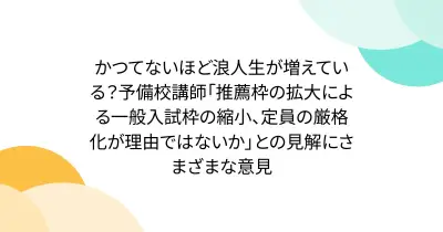 かつてないほど浪人生が増えている?予備校講師「推薦枠の拡大による一般入試枠の縮小、定員の厳格化が理由ではないか」との見解にさまざまな意見