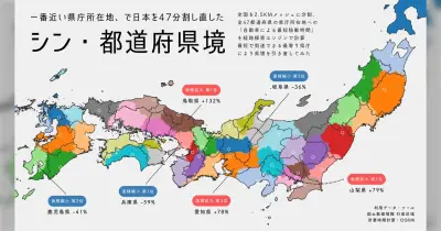 どの県庁が一番近いかで分割し直した『シン・都道府県境』この地図では、鳥取が兵庫の一部を取り込んで大きく勢力拡大するらしい