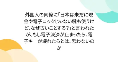 外国人の同僚に「日本は未だに現金や電子ロックじゃない鍵も使うけど、なぜ古いことする?」と言われたが、もし電子決済が止まったら、電子キーが壊れたらとは、思わないのか