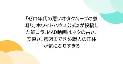 「ゼロ年代の悪いオタクムーブの煮凝り」ホワイトハウス公式Xが投稿した雑コラ、MAD動画はネタの古さ、安直さ、意図まで含め職人の正体が気になりすぎる