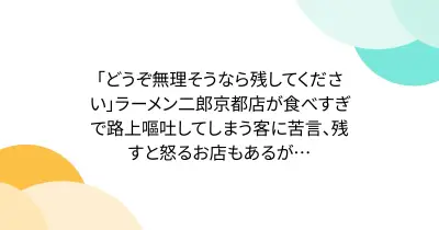 「どうぞ無理そうなら残してください」ラーメン二郎京都店が食べすぎで路上嘔吐してしまう客に苦言、残すと怒るお店もあるが…