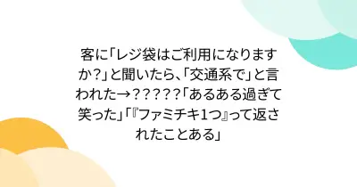 客に「レジ袋はご利用になりますか?」と聞いたら、「交通系で」と言われた→?????「あるある過ぎて笑った」「『ファミチキ1つ』って返されたことある」