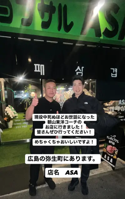 カープ朝山3軍コーチ、韓国料理店『カンナサムギョプサルASA』をオープンwww