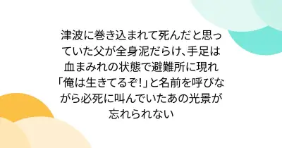 津波に巻き込まれて死んだと思っていた父が全身泥だらけ、手足は血まみれの状態で避難所に現れ「俺は生きてるぞ!」と名前を呼びながら必死に叫んでいたあの光景が忘れられない