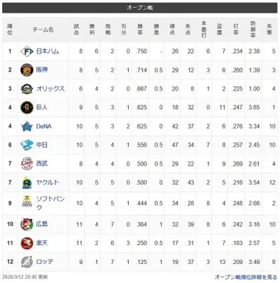 オープン戦順位表(3/12)wwwwwwwwwwwwwwwwwwwwwww