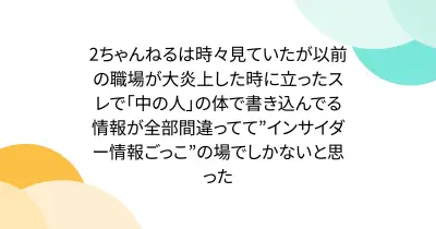 2ちゃんねるは時々見ていたが以前の職場が大炎上した時に立ったスレで「中の人」の体で書き込んでる情報が全部間違ってて”インサイダー情報ごっこ”の場でしかないと思った