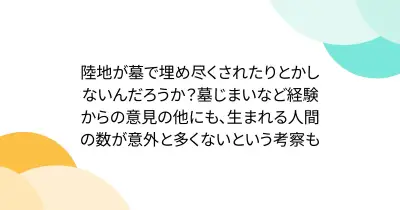 陸地が墓で埋め尽くされたりとかしないんだろうか?墓じまいなど経験からの意見の他にも、生まれる人間の数が意外と多くないという考察も