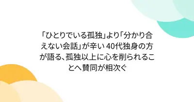 「ひとりでいる孤独」より「分かり合えない会話」が辛い 40代独身の方が語る、孤独以上に心を削られることへ賛同が相次ぐ