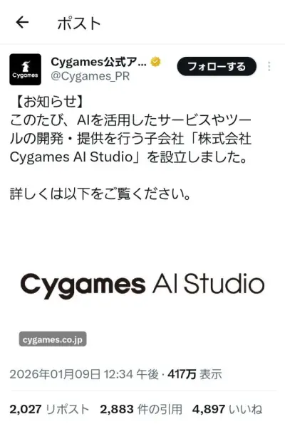 【速報】Cygames、生成AIを活用する会社を立ち上げるも海外から批判殺到