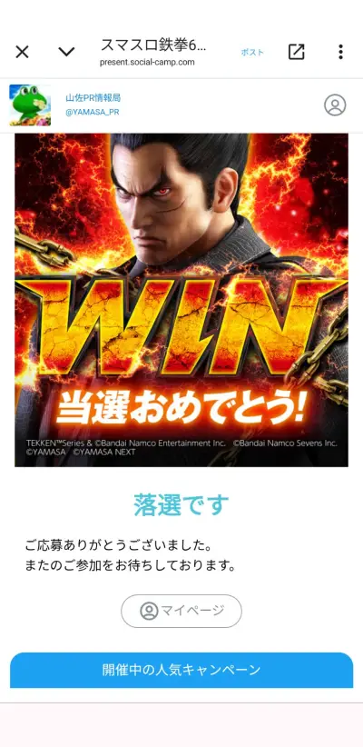 山佐さん、L鉄拳6のキャンペーンで煽りまくる「当選おめでとう!落選です」