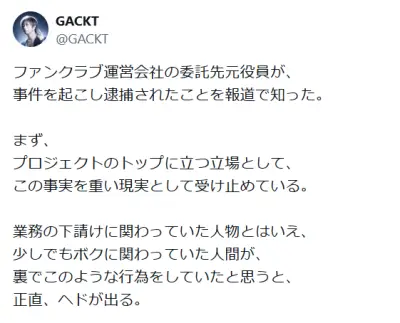GACKT、報道に言及「ファンクラブ運営会社の委託先元役員が、事件を起こし逮捕」「正直、ヘドが出る」