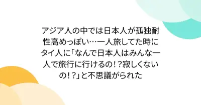 アジア人の中では日本人が孤独耐性高めっぽい…一人旅してた時にタイ人に「なんで日本人はみんな一人で旅行に行けるの!?寂しくないの!?」と不思議がられた