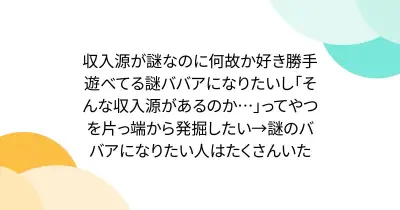 収入源が謎なのに何故か好き勝手遊べてる謎ババアになりたいし「そんな収入源があるのか…」ってやつを片っ端から発掘したい→謎のババアになりたい人はたくさんいた