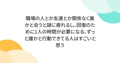 職場の人とか友達とか関係なく誰かと会うと謎に疲れるし、回復のために1人の時間が必要になる、ずっと誰かと行動できてる人はすごいと思う