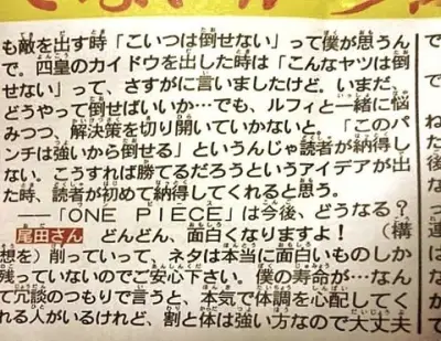 尾田っち「カイドウの倒し方が思いつかない…強いパンチで倒せたなんて読者も納得しないし…」