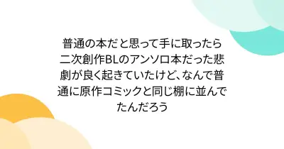 普通の本だと思って手に取ったら二次創作BLのアンソロ本だった悲劇が良く起きていたけど、なんで普通に原作コミックと同じ棚に並んでたんだろう