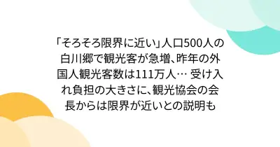 「そろそろ限界に近い」人口500人の白川郷で観光客が急増、昨年の外国人観光客数は111万人… 受け入れ負担の大きさに、観光協会の会長からは限界が近いとの説明も