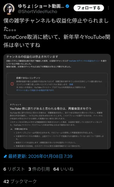 【悲報】YouTube、続々収益化停止され終わるwwwww