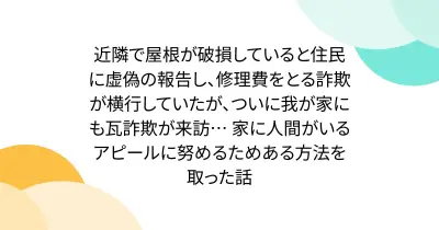 近隣で屋根が破損していると住民に虚偽の報告し、修理費をとる詐欺が横行していたが、ついに我が家にも瓦詐欺が来訪… 家に人間がいるアピールに努めるためある方法を取った話