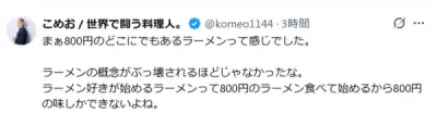 闘う料理人・こめお 人気豚骨ラーメン店で「800円のラーメン食べて始めるから800円の味しかできない」投稿に批判殺到