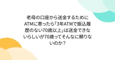 老母の口座から送金するためにATMに寄ったら「3年ATMで振込履歴のない70歳以上」は送金できないらしいが70歳ってそんなに頼りないのか?