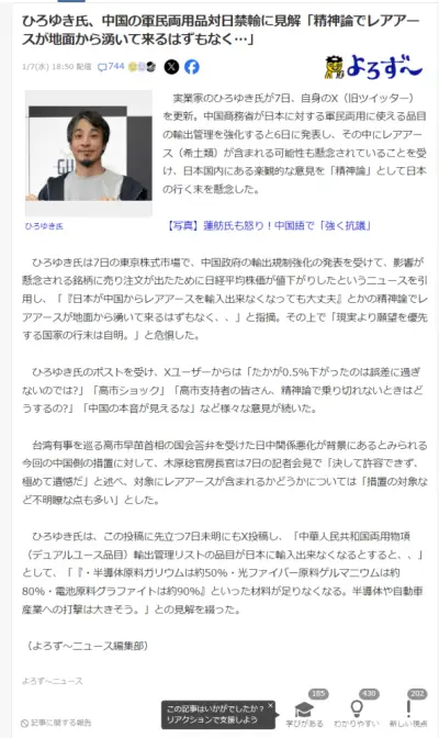 ひろゆき、政府にブチ切れ「精神論でレアアースは地面から湧いてこない。現実より願望を優先する国家の行末は自明」