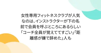 女性専用フィットネスクラブが人気なのは、インストラクターが下の名前で会員を呼ぶところにあるらしい「コーチ全員が覚えててすごい」「距離感が嫌で辞めた」人も