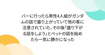 バーに行ったら男性4人組がガンダムの話で盛り上がっていて他の客に注意されていた、その後「盛り下がる話をしよう」とペットの話を始めたら一気に静かになった