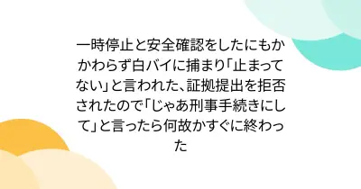 一時停止と安全確認をしたにもかかわらず白バイに捕まり「止まってない」と言われた、証拠提出を拒否されたので「じゃあ刑事手続きにして」と言ったら何故かすぐに終わった