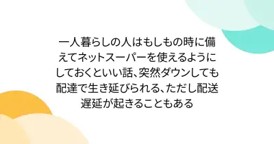 一人暮らしの人はもしもの時に備えてネットスーパーを使えるようにしておくといい話、突然ダウンしても配達で生き延びられる、ただし配送遅延が起きることもある