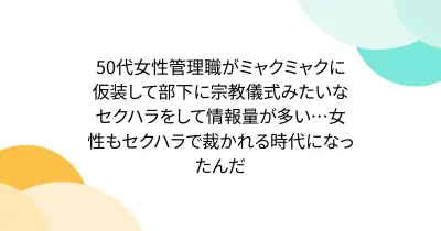 50代女性管理職がミャクミャクに仮装して部下に宗教儀式みたいなセクハラをして情報量が多い…女性もセクハラで裁かれる時代になったんだ
